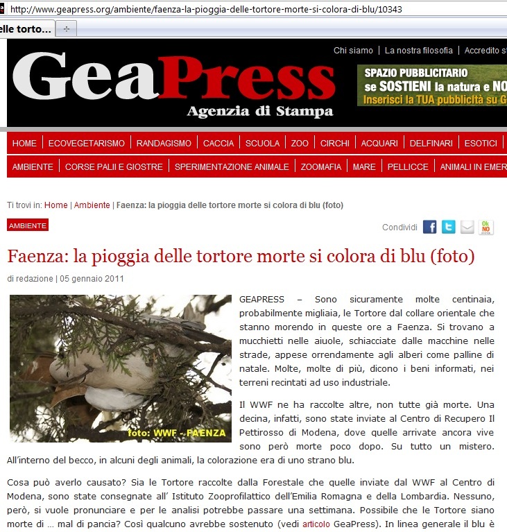 Cosa può averlo causato? (...) Nessuno, però, si vuole pronunciare e per le analisi potrebbe passare una settimana. Possibile che le Tortore siano morte di … mal di pancia? Così qualcuno avrebbe sostenuto (vedi articolo GeaPress). In linea generale il blu è segno di ipossia, causata ad esempio da un soffocamento. La colorazione bluastra, però, è anche tipica del cianuro di potassio, un potente veleno utilizzato, ad esempio, dai pescatori di frodo. Il cianuro, però, causa anche ipossia, …. magari una tortora con il mal di pancia muore anche soffocata. Un altro veleno azzurrognolo compare in alcuni tipi di grani topicidi. Certo che a credere che le Tortore siano morte soffocate, viene un po’ difficile. E perché solo loro? Nel luogo ci sono solo loro, ma i piccioni che in altri luoghi mangiano verosimilmente le stesse sementi che coincidono essere accatastate in alcune industrie di Faenza? Loro non muoiono soffocate?