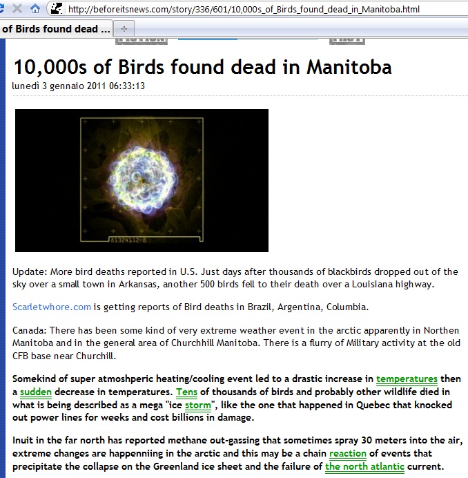 Finora questo apocalittico misterioso fenomeno misterioso, è accaduto nei seguenti luoghi [abbiamo tradotto in italiano solo i primi titoli, i link sono per lo più ad articoli nella lingua del paese ove è avvenuta la morìa - N.d.T.]: