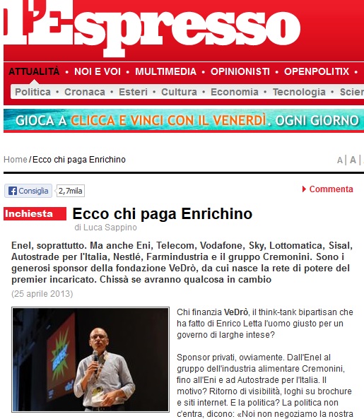 E poi ancora sempre sull'Espresso si può leggere all'interno dell'articolo Ecco chi paga Enrichino: