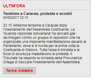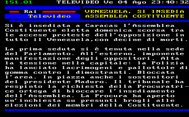 Ultim'ora delle 22:15 del 4 agosto 2017, il Televideo della RAI scrive che a Caracas c'è altissima tensione dopo l'insediamento dell'Assemblea Costituente. E prosegue: "La Guardia Nazionale Bolivariana ha lanciato gas lacrimogeni contro un gruppo di oppositori che ha organizzato una imponente manifestazione davanti al Parlamento". Innanzitutto, all'autore della nota mi viene da chiedere: "La manifestazione c'è stata o non c'è stata? E' stata dispersa dal lancio dei lacrimogeni della "Guardia Nazionale Bolivariana" o l'area era blindata?" Chi ha scritto la nota, prima di tutto dovrebbe essere più chiaro: non può fare una affermazione e subito dopo, nella stesa nota, fare un'altra affermazione che smentisce la prima! La stessa notizia, o meglio la stessa "fake news" è ribadita da Televideo nella parte dedicata agli esteri (pagina 150 e seguenti). Nella pagina 151, pubblicata alle 23:40, quindi una ora e 25 minuti dopo l'Ultim'ora si riporta, testuali parole: "All'esterno, imponente manifestazione degli oppositori". Io ero davanti al Parlamento venezuelano nel momento dell'insediamento della Costituente e nelle ore successive e posso testimoniare che le affermazioni di Televideo sono totalmente infondate; non c'è stata nessuna una manifestazione dell'opposizione davanti al parlamento. Una manifestazione degli oppositori c'è stata, ma nella zona dei quartieri ricchi, nell'est di Caracas, che non ha avuto nessun effetto sul resto della città.