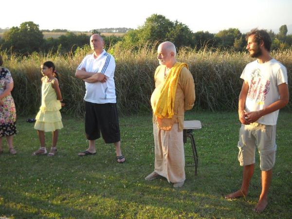 Al termine del rito abbiamo pasteggiato al lume di candela in piedi, soddisfacendo così il nostro bisogno di cose concrete. Ed io mi sono bevuto almeno un litro d’acqua frizzantina naturale. Dopo il prasad bioregionale altra cerimonia per riconoscere le stelle ma il mio sguardo era fortemente attratto dalla falce rossa della luna crescente sulla quale mi sono soffermato lungamente. Con questo la prima giornata è ben terminata e soddisfatto mi sono ritirato nella rimessa, sdraiato sulla stuoia un po’ dura, al lume del moccoletto antizanzare (anch’esso dono di Caterina) leggo mentalmente lo Shiva Manasa Puja.